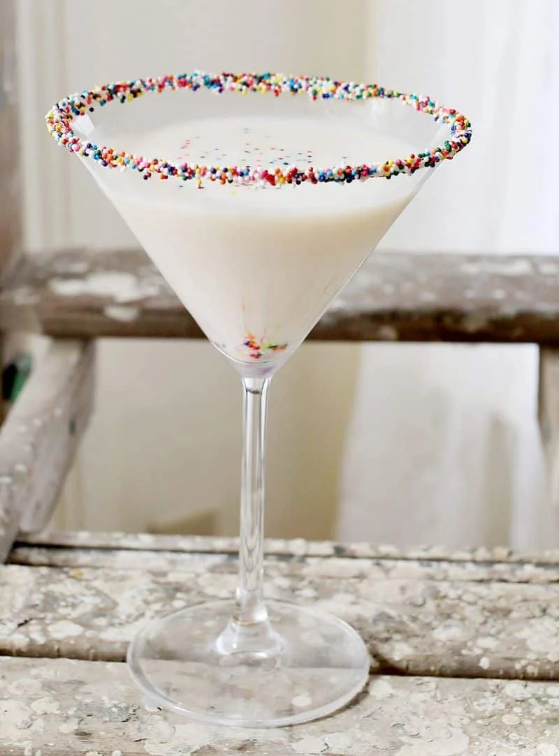 Birthday Cake Creamtini — Sweet, creamy, and downright decadent. Vanilla vodka, white chocolate liqueur, double cream, sugar syrup, and a dash of cake-flavour syrup. Topped with sprinkles for that perfect birthday touch.