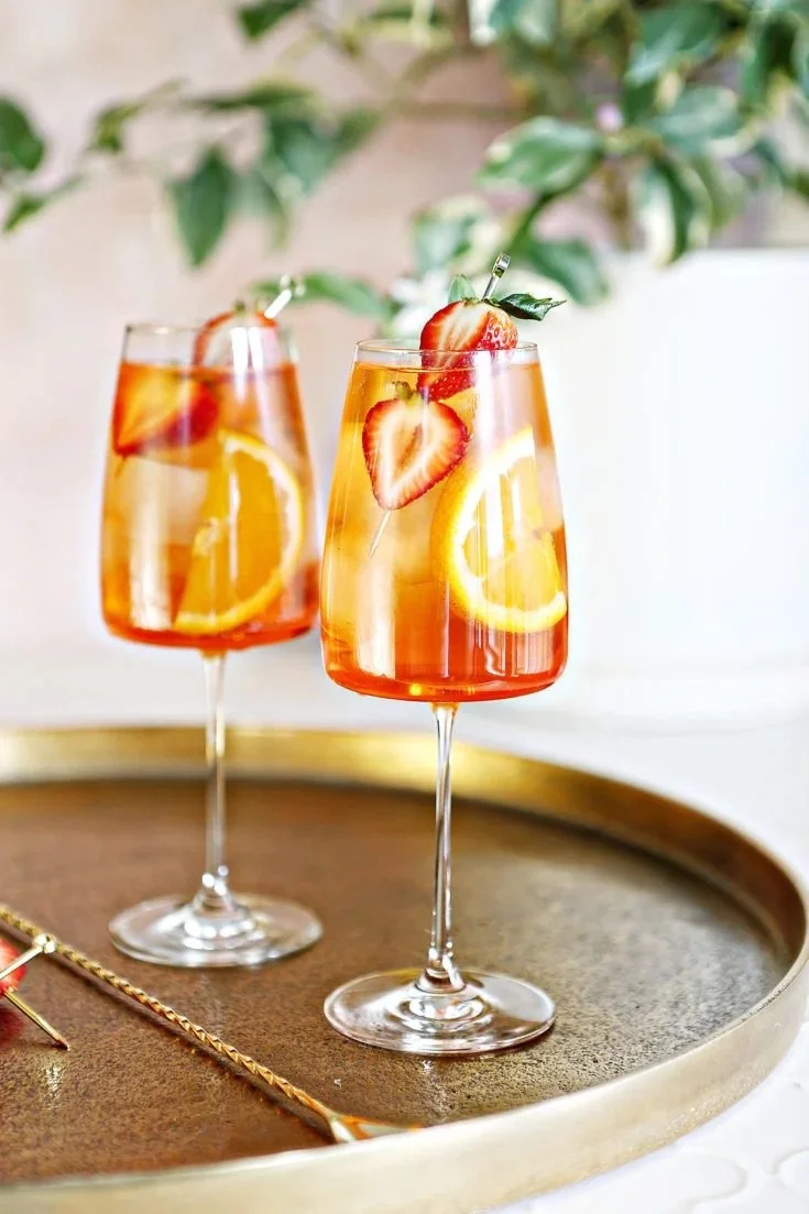 Strawberry Aperol Spritz — A playful twist on the classic, with Aperol, strawberry syrup, prosecco, and soda. Bright, bubbly, and just the right amount of sweet.